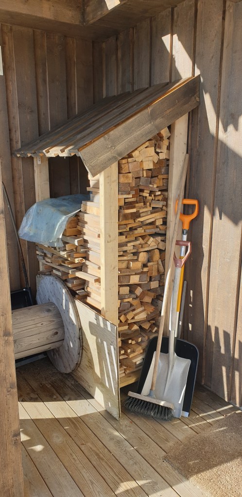 Vedskjulet er bygget opp av 2»4» bjelker med skrånende tak lik takvinkelen, og lufting i bunn