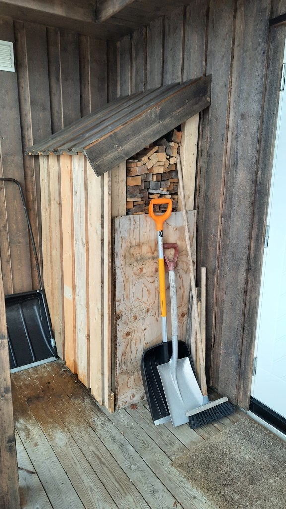 Et av småprosjektene mine på hytta nå for tiden er å bygge vedskjul. Jeg begynte med jobben i november i fjor, og regner med å fullføre i sommer.