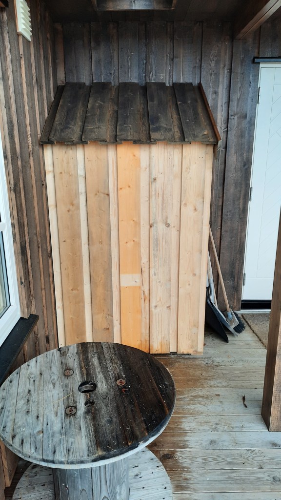 Fronten er skjøvet på plass og kan tas av for at veden kan tørke fortere. Det som gjenstår nå er en dør der kryssfiner platen er, den skal festes med hengsler.